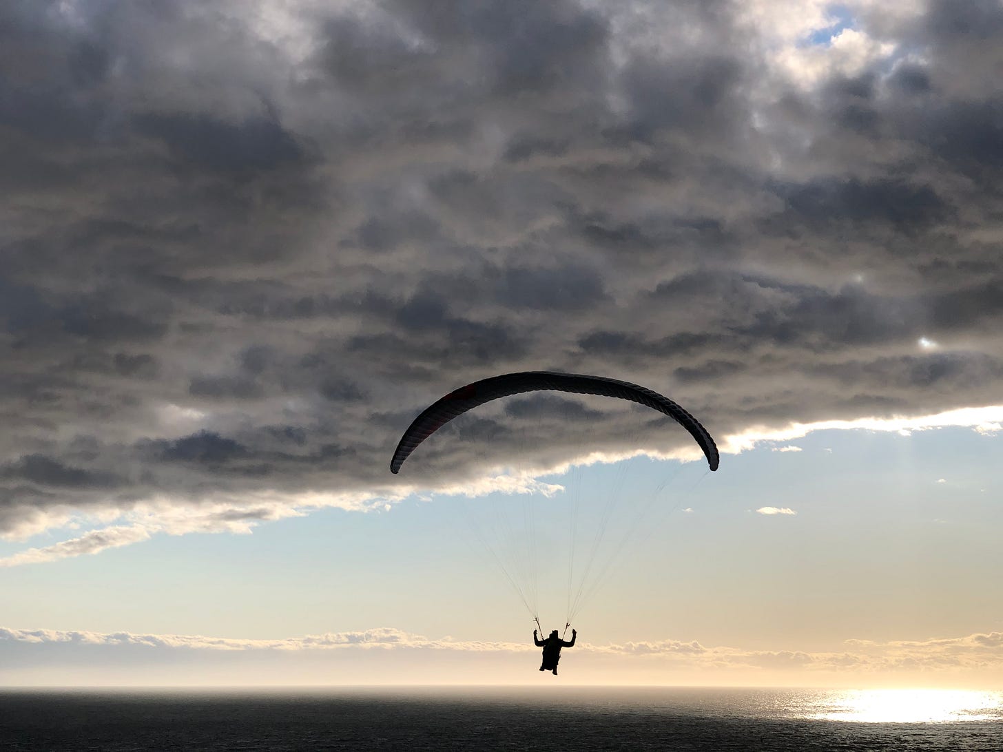 But the wind that had failed me also saved me. It pushed me toward the bluff face where Scotch broom on the sandy slope broke my fall. In the quiet that followed, I lay cradled by soft earth, acutely aware of my breath and my beating heart. I did think about my life then. About its highs and lows. About my friends. About the windfall of meeting my wife. About how lucky I am that despite her worry she supports this crazy obsession that has me out here soaring with the birds. Grateful that she knows I need adventure to feel alive, as does she, in her own way, as do we all. Grateful that I knew I could share this accident with her, laugh about it even, safe in our warm home, and that she would listen and not use it to discourage me from flying again.